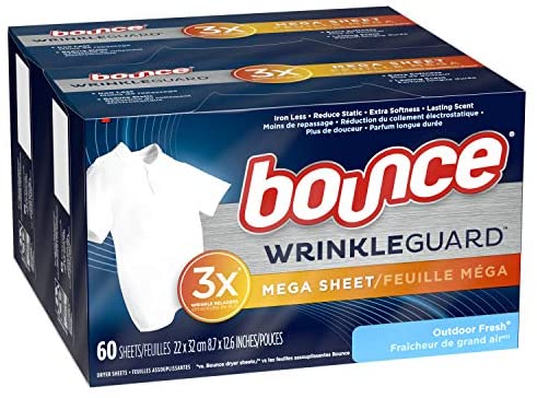 Bounce WrinkleGuard Mega Dryer Sheets, Fabric Softener and Wrinkle Releaser Sheets, Outdoor Fresh Scent, 120 Count (Pack of 2, 60 Count Each)